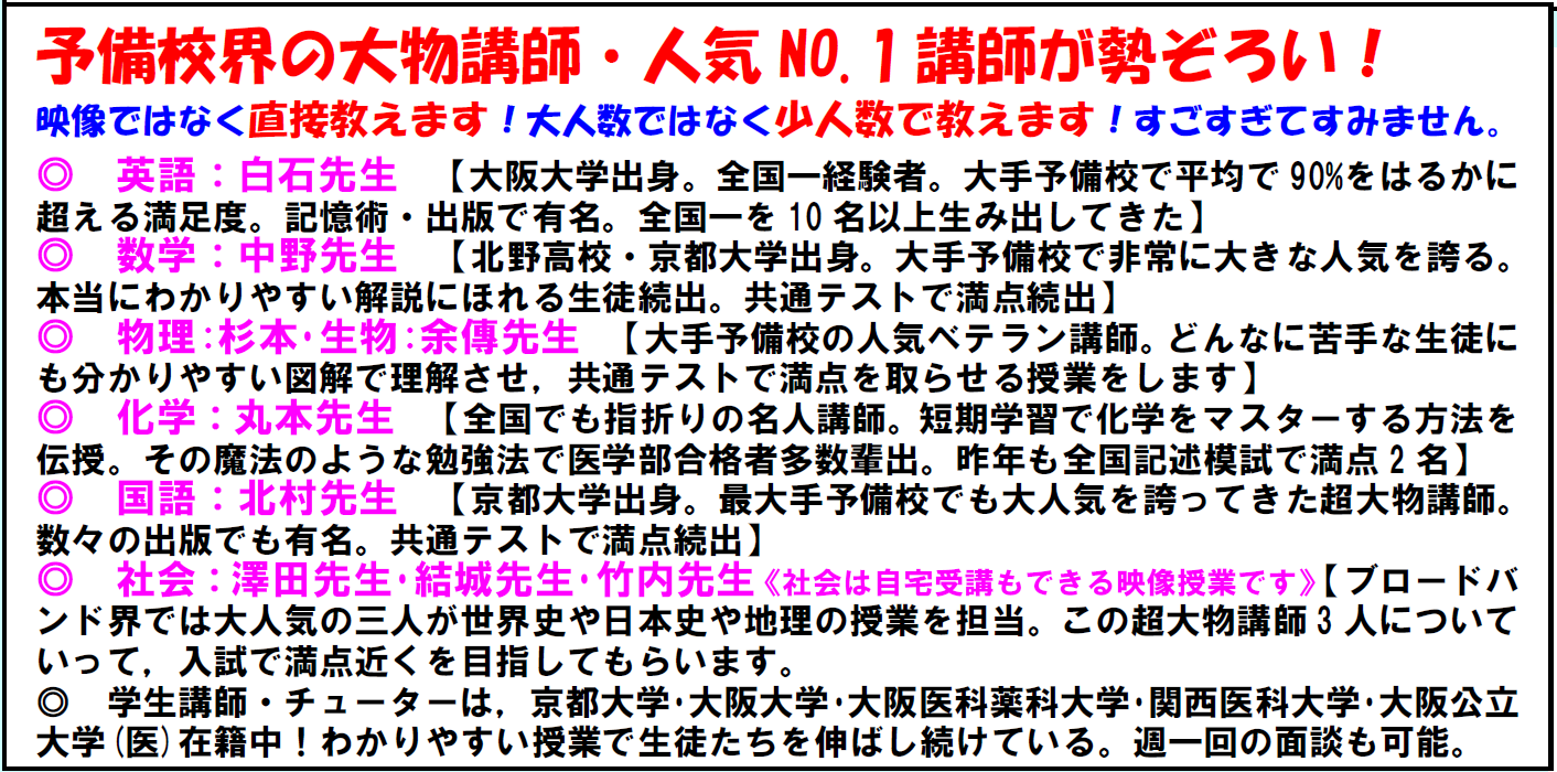 大阪茨木・高槻・吹田・豊中・箕面・摂津・大阪市・京都府・兵庫県の高校生・高卒生[浪人生]の名門予備校・塾【大阪の予備校】【記憶術で有名な塾】【非常に多くの人が推薦する予備校】【茨木市の予備校】